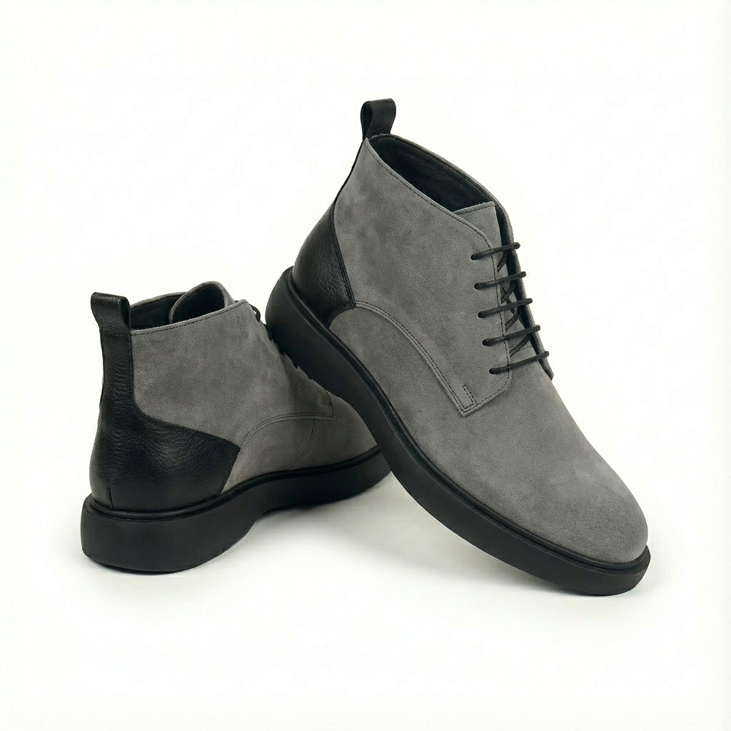 Botte en cuir suédé haut de gamme pour homme. Le Gris Ardoise offre un style intemporel et un confort absolu grâce à son cuir souple et sa semelle robuste. Design Chukka classique, finitions artisanales. Parfait pour une élégance discrète au quotidien.
